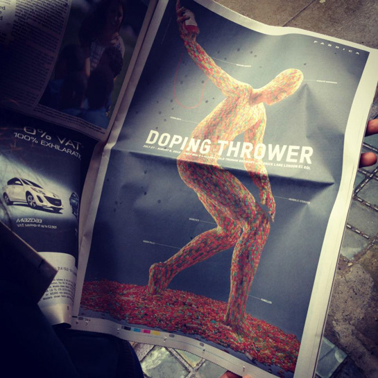 Doping Thrower is an art installation devised and executed by the Cuban artist Erik Ravelo. The sculpture was inspired by the Discobolus (the discus thrower), the famous statue by Myron, from around 445 B.C., which is a symbol of the passion for the Olympic Games and of the cult of human physical perfection. The Doping Thrower is completely smothered in hundreds of multicolour capsules, phials and tablets and even a drip feed.